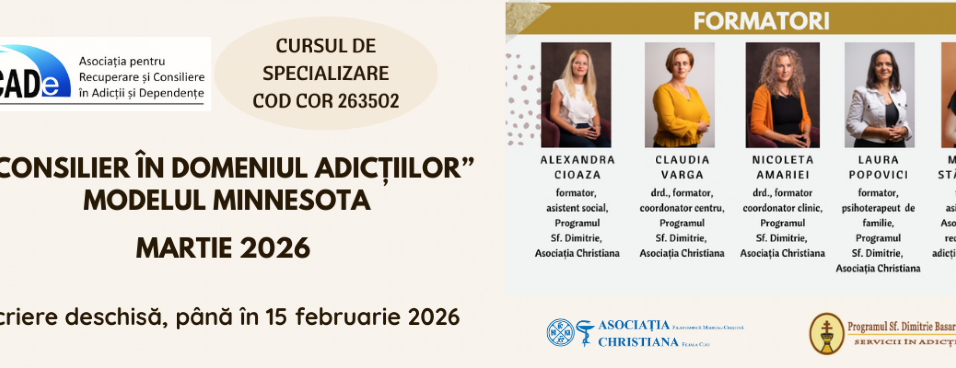 Cu experiență de 18 ani în domeniul recuperării din dependențe, Laura Popovici este în prezent consilier familial în adicții, în cadrul Programului Sf. Dimitrie din cadrul Asociației Filantropice Medical Creștine „Christiana”.